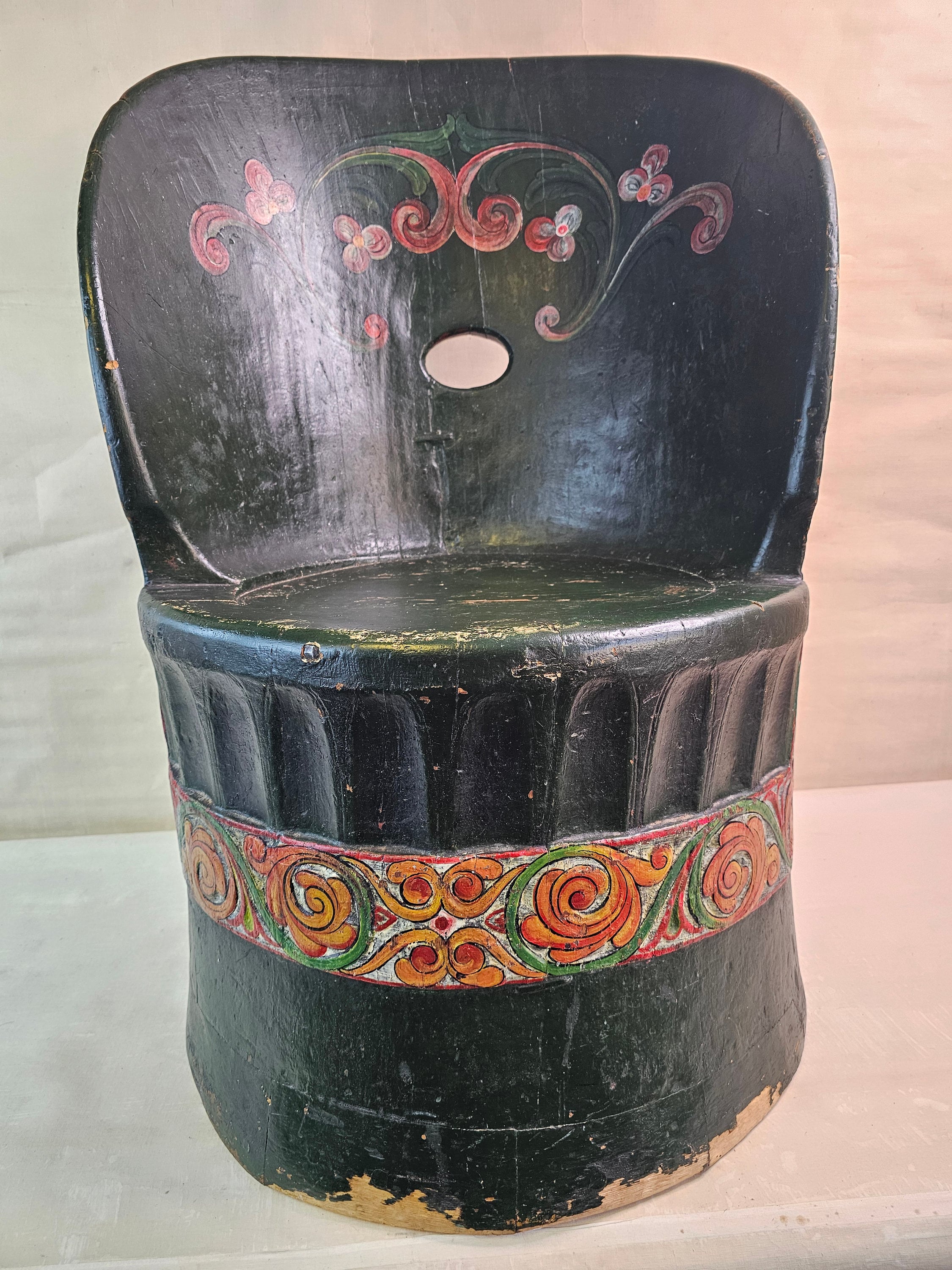 This cube chair is in good antique condition, and has gorgeous hand carved rose pattern and paint.