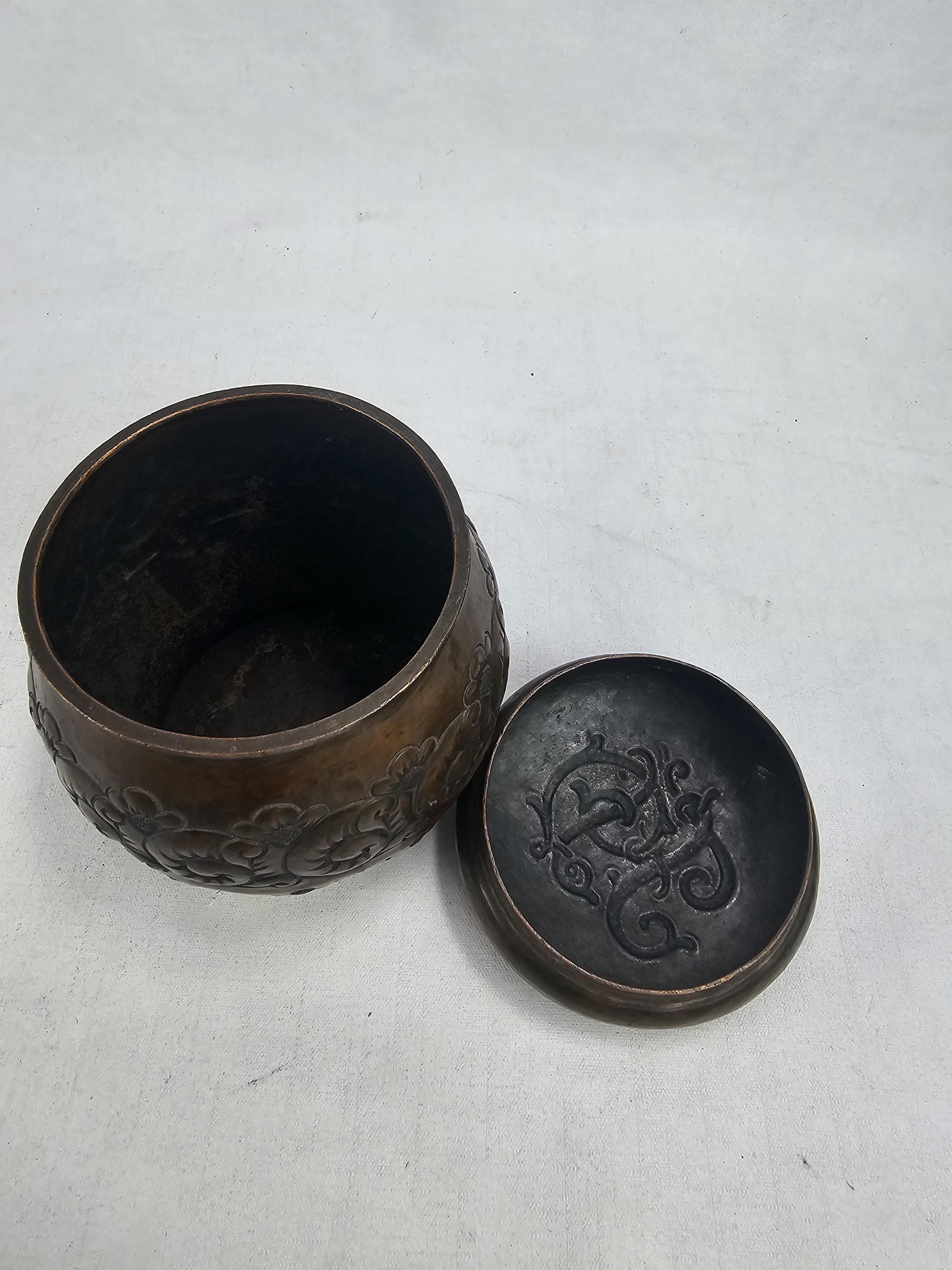 Utilizing a technique typically reserved for silver objects, the entire jar is meticulously hammered, reflecting exceptional quality. Originating from one of Norway's foremost silver, gold, and bronze workshops, this piece exudes historical significance. Despite its age, this tobacco jar remains in excellent condition, bearing only the charming patina and marks acquired over a century of use. Perfect for enthusiasts of Norwegian folk art, this rare find is a true testament to the country's heritage.