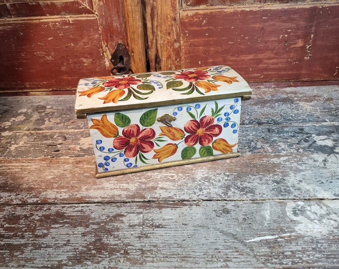 Antique Norwegian folk art box early 1900s Os-maling hand painted wooden chest with floral rosemaling design and metal handle